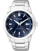 Мужские кварцевые аналоговые часы на солнечной батарее. Коллекция Eco-Drive. Часы оснащены системой Eco-Drive не требующей замены батарейки (система Eco-Drive - патентованная технология CITIZEN, заключающаяся в размещении фотоэлементов скрытых под циферблатом и постоянно подзаряжающих аккумулятор часов). Питание от солнечной энергии, запас хода около 180 дней от полностью заряженной батареи Функция информирования о недостаточном заряде и предотвращения перезарядки. Калибр механизма Citizen E111. Центральные часовая, минутная и секундная стрелки. Апертура даты в позиции 3 часов. Функция индикации заряда (EOL - End of Life – в случае, если заряд элемента питания ослабевает, секундная стрелка начинает двигаться скачками - через деления). Синий циферблат с часовыми метками в виде штрихов. Люминесцентное покрытие на стрелках и часовых метках, которое светится в темноте после непродолжительной зарядки на свету. Круглый корпус из нержавеющей стали. Диаметр корпуса 42,5 мм. Устойчивое к мелким механическим повреждениям минеральное стекло. Браслет из нержавеющей стали с раскладывающейся застёжкой.